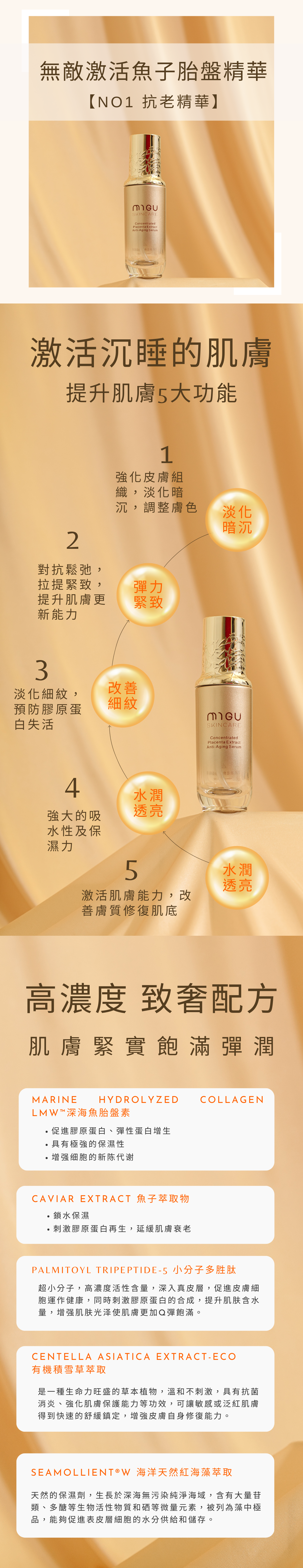 添加高濃度【深海魚胎盤】&【魚子精華】,搭配具有卓越抗氧化作用的【胜肽生長因子】,完美激活沉睡的肌膚,全方位預防及改善所有老化肌膚問題