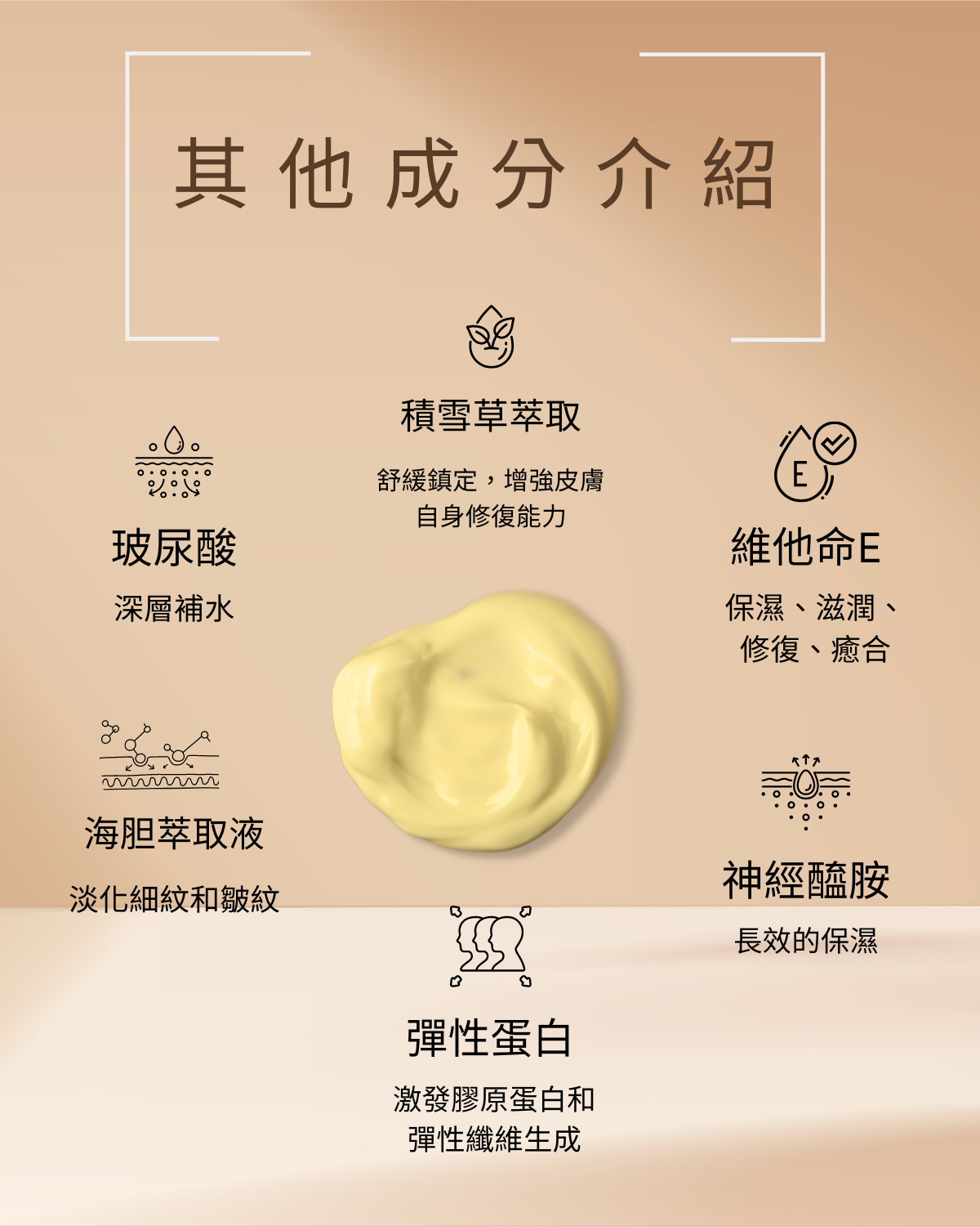 皮膚科醫生認證的有效抗老成份,滿足保養控想要解決因膠原蛋白、彈力蛋白流失而形成的「靜態紋」同時改善擾人的「動態紋」抬頭紋、魚尾紋、法令紋等,使用之後肌膚可以感受到緊緻滑嫩超有感。