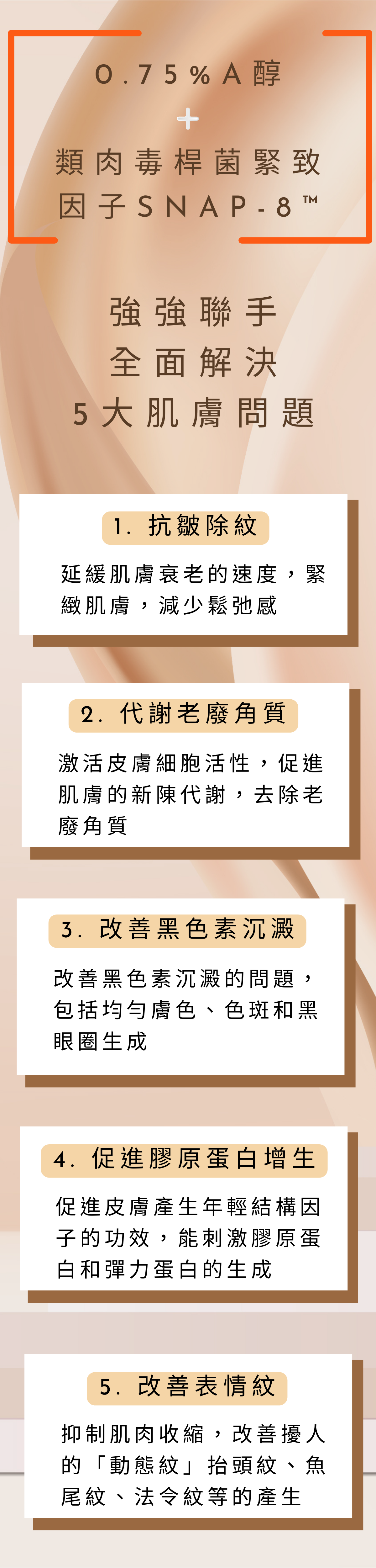 獨家調配【高濃度0.75%A醇+類肉毒桿菌緊致因子】全方位解決動態紋+靜態紋